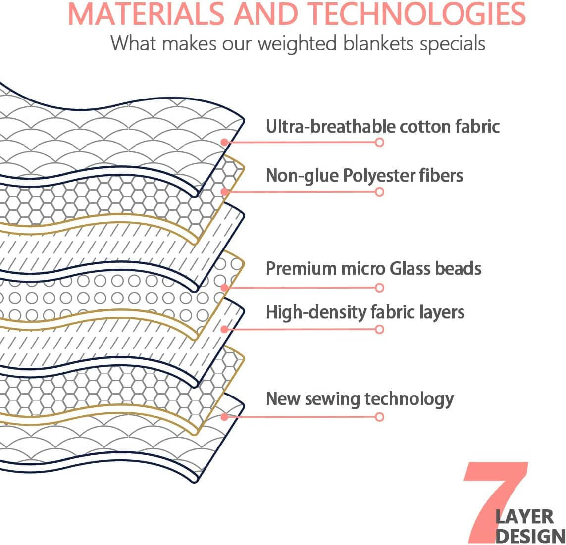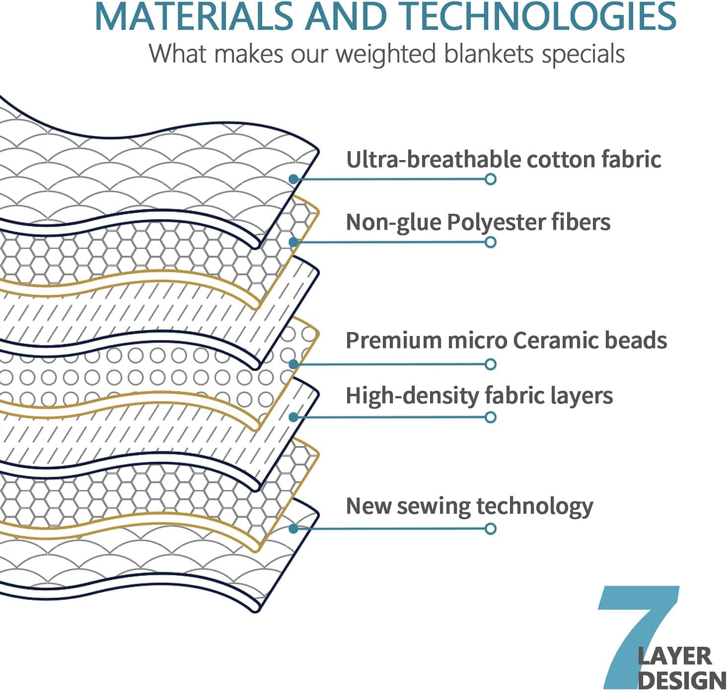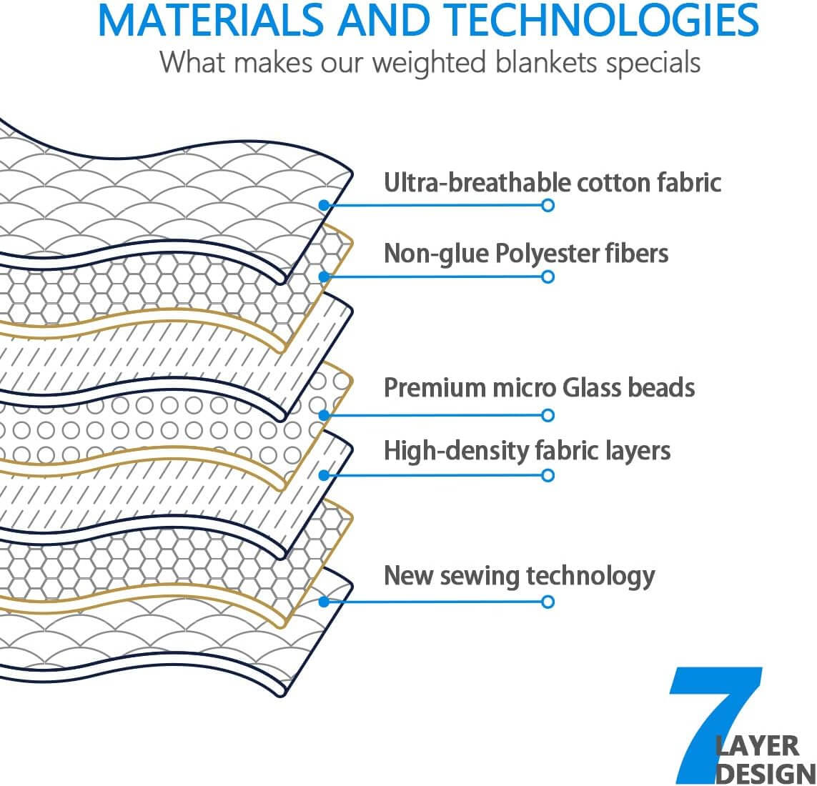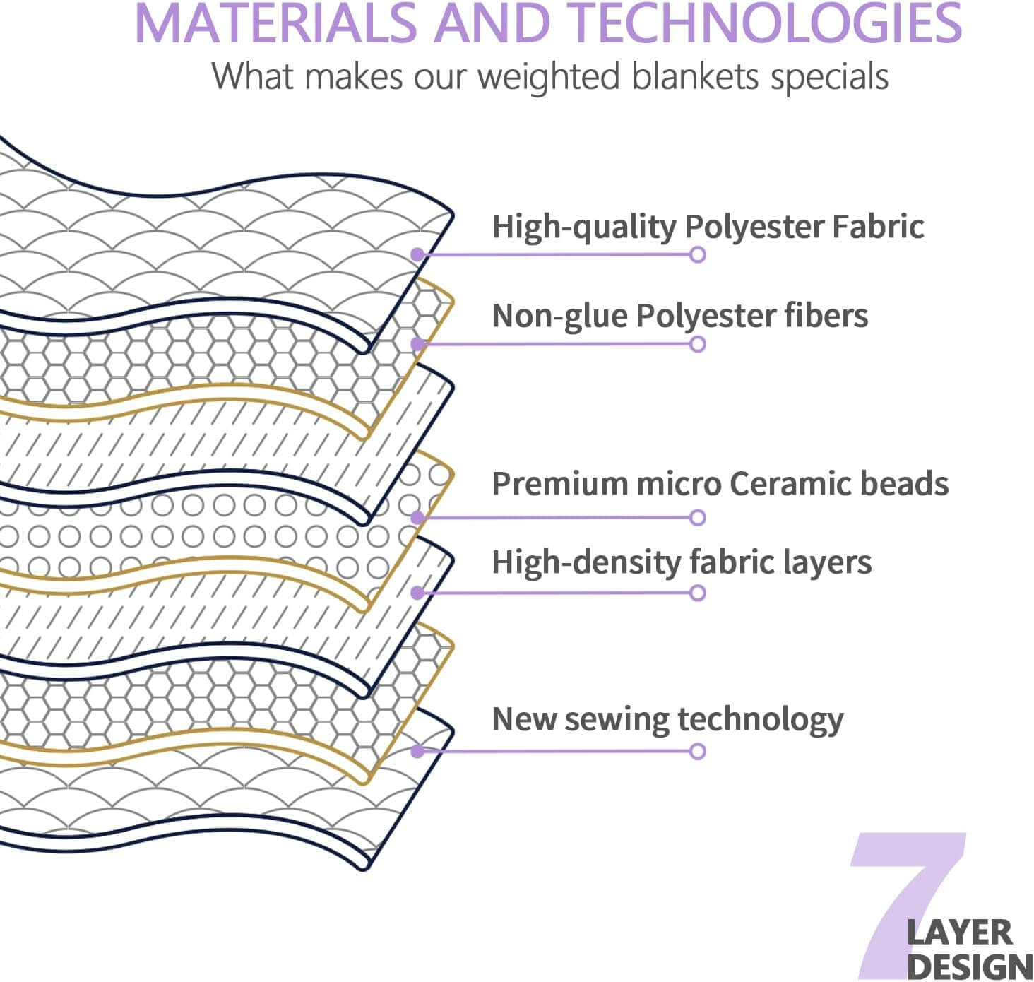 Extra Safe for Him/Her: For the safety and comfort of people, this weighted blanket uses 100% breathable cotton, padded with fine glass beads that are non-toxic, no leakage, and antimagnetic. 7-layer pocket structure and strong stitching prevent beads leaking or shifting during sleep