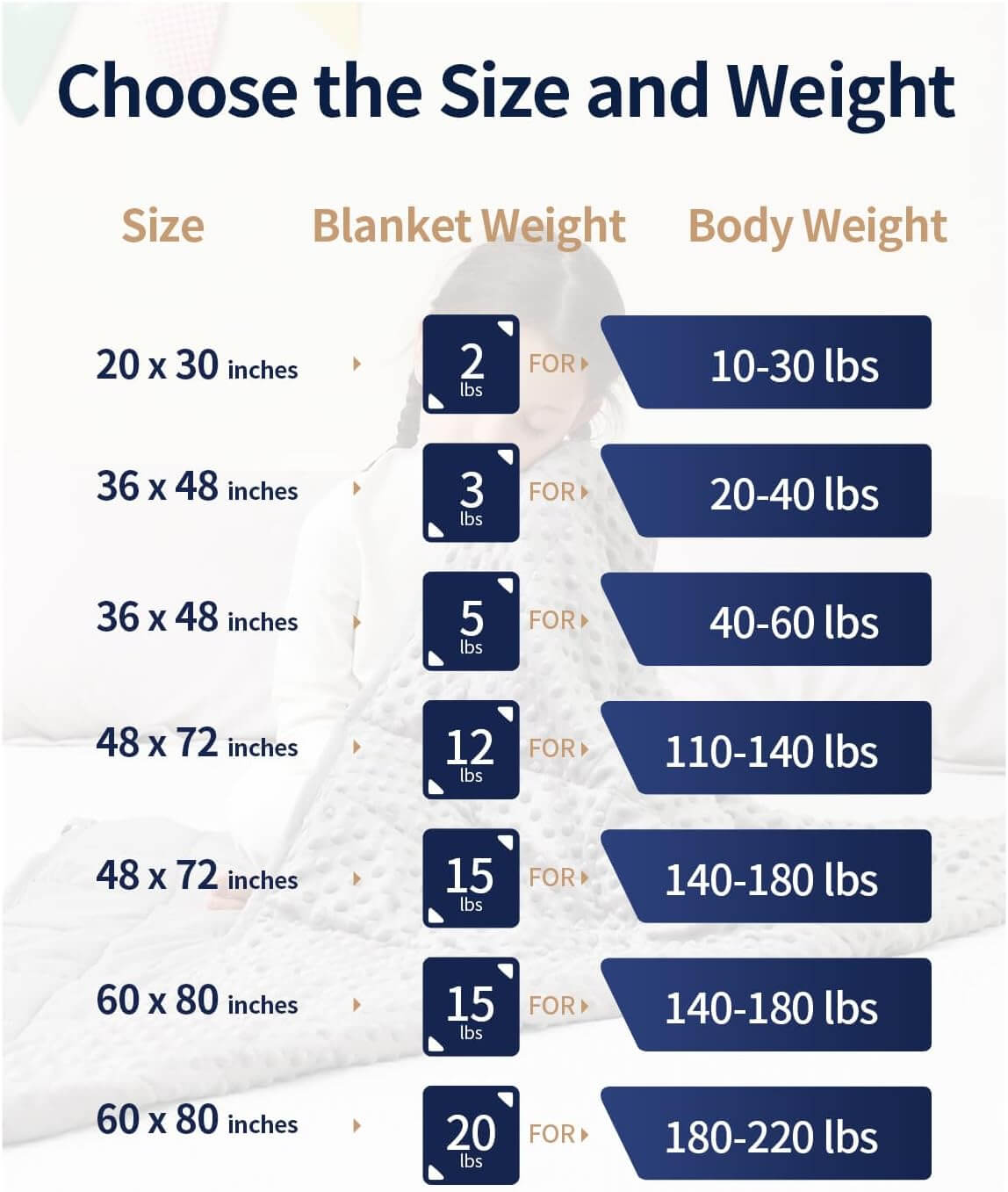 Choose the Right Size and Weight: We recommend a blanket that is about 10% of body weight. Our carefully selected weights of 2 lbs, 3 lbs, 5 lbs, and 7 lbs are suitable for different age groups of 30-40 lbs, 41-60 lbs, and 61-85 lbs respectively. For taller individuals, a larger 7lbs blanket is recommend